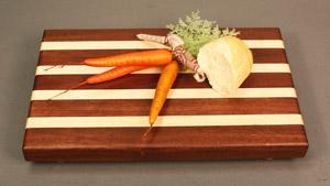 These large boards are a wonderful addition to any kitchen for serving and cutting. They are 18" long 12 inches wide and 1¾ inches thick and sit on wooden and rubber feet. They have slightly radiused edges and are finished in a food safe oil finish.